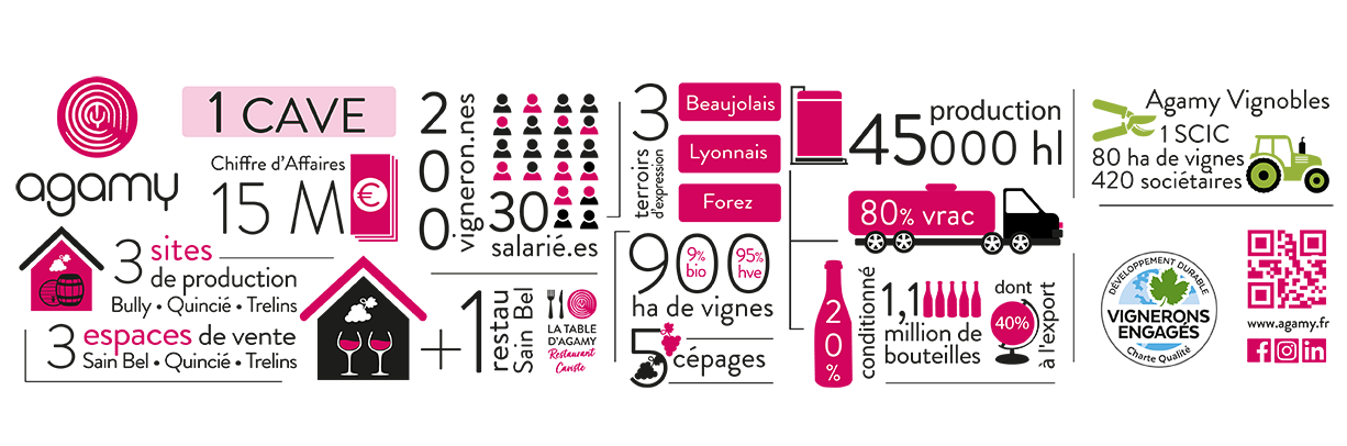 Agamy est un collectif de vignerons et maîtres de chais, rassemblant quatre caves ancrées dans leur territoire : Bully et Quincié en Beaujolais, Sain-Bel dans les Coteaux du Lyonnais et Trelins dans les Côtes du Forez.