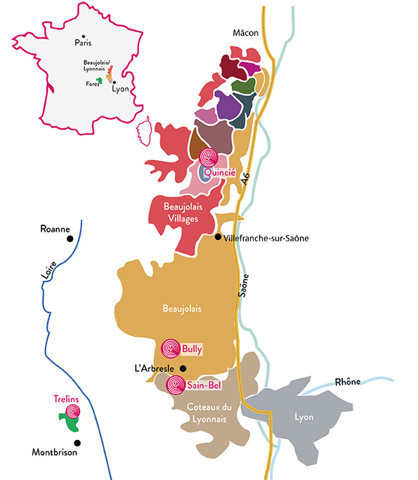 Agamy est un collectif de vignerons et maîtres de chais, rassemblant quatre caves ancrées dans leur territoire : Bully et Quincié en Beaujolais, Sain-Bel dans les Coteaux du Lyonnais et Trelins dans les Côtes du Forez.